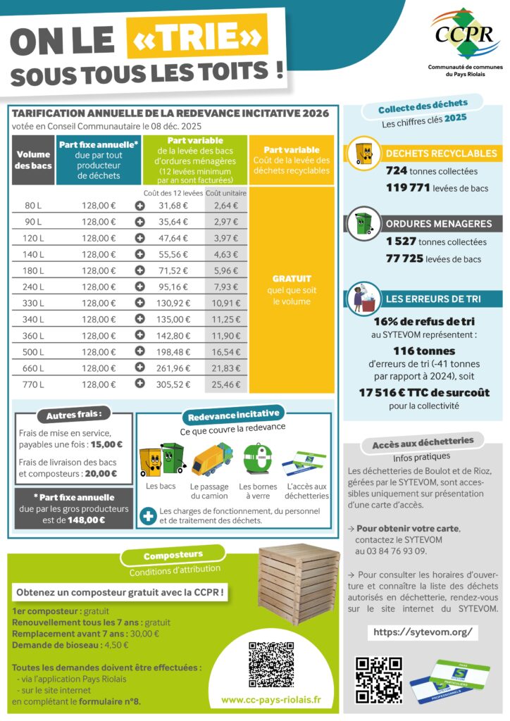 Deux déchetteries sont à votre disposition sur le territoire de la Communauté de Communes du Pays Riolais (Ccpr) à Rioz et à Boulot. Un gardien est à votre disposition pour vous aider à trier vos déchets dans les différentes bennes.
